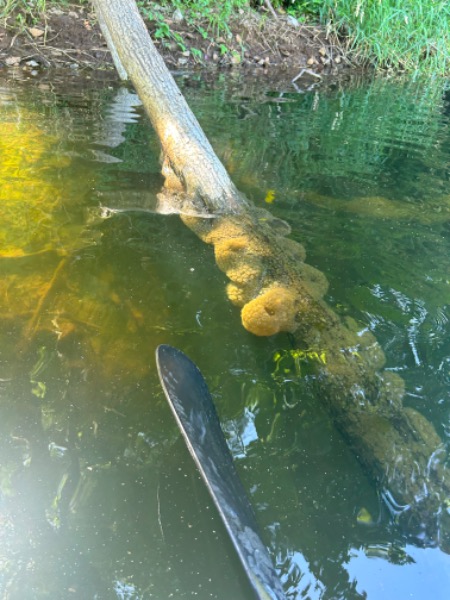 In the reservoir on logs and branches in the water near the shore that is rocky and opposite of the boat ramp