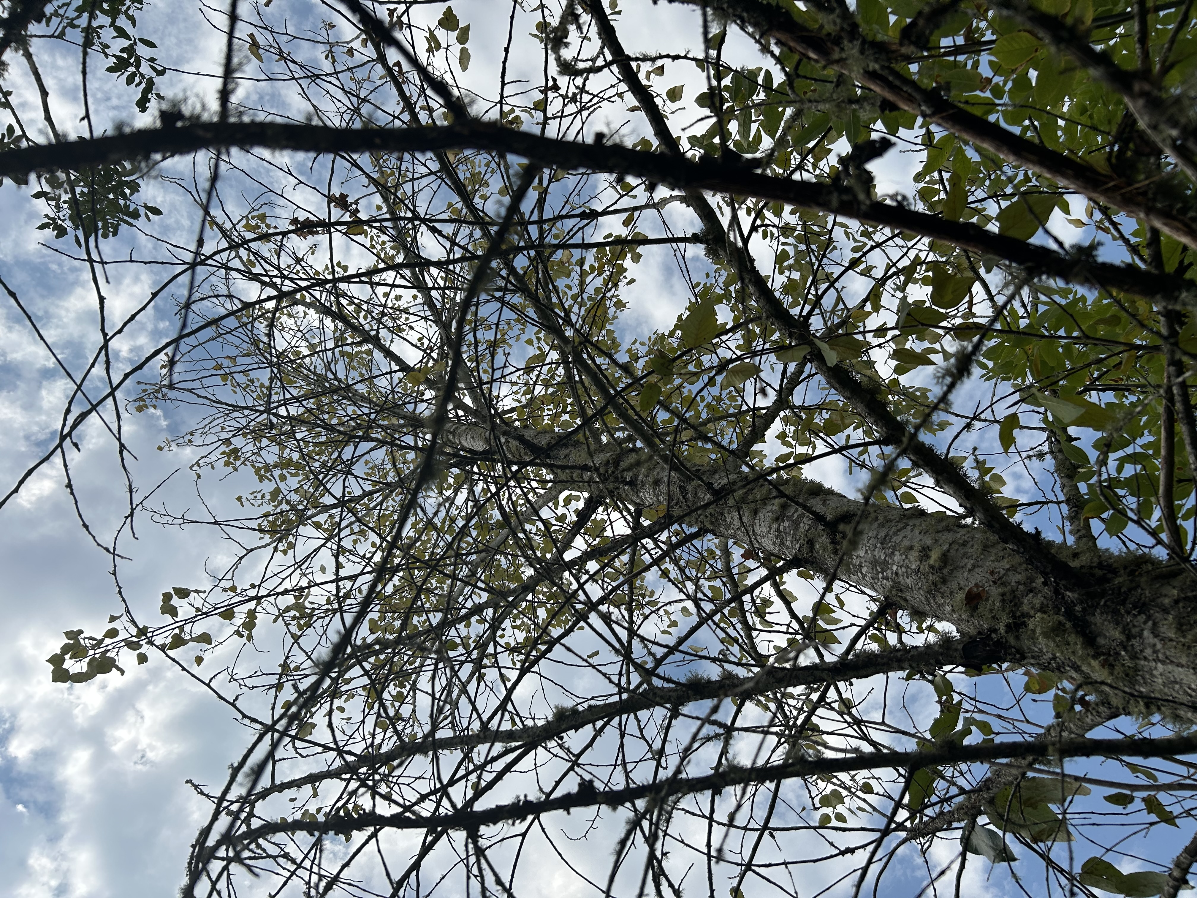 Dead tree with little D-shaped holes (and also some larger woodpecker holes) and S-shaped galleries under where the bark peeled off