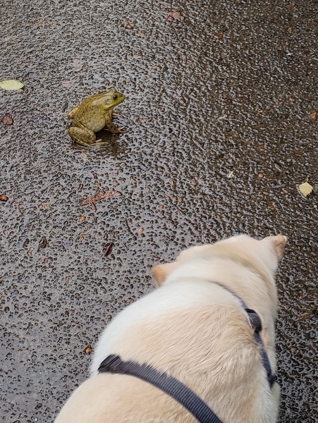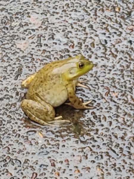 Pictures provided - large frog in walking path that froze when my dog and I approached. I have been told it looks like an American Bullfrog.