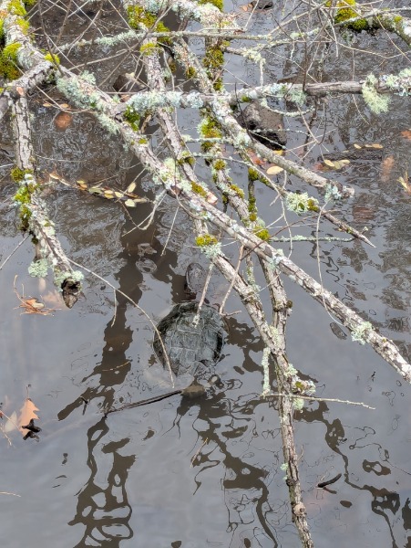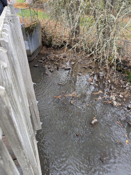 Easternmost bridge of Summerlake Park, on the east side of the bridge swimming along the branches and rocks